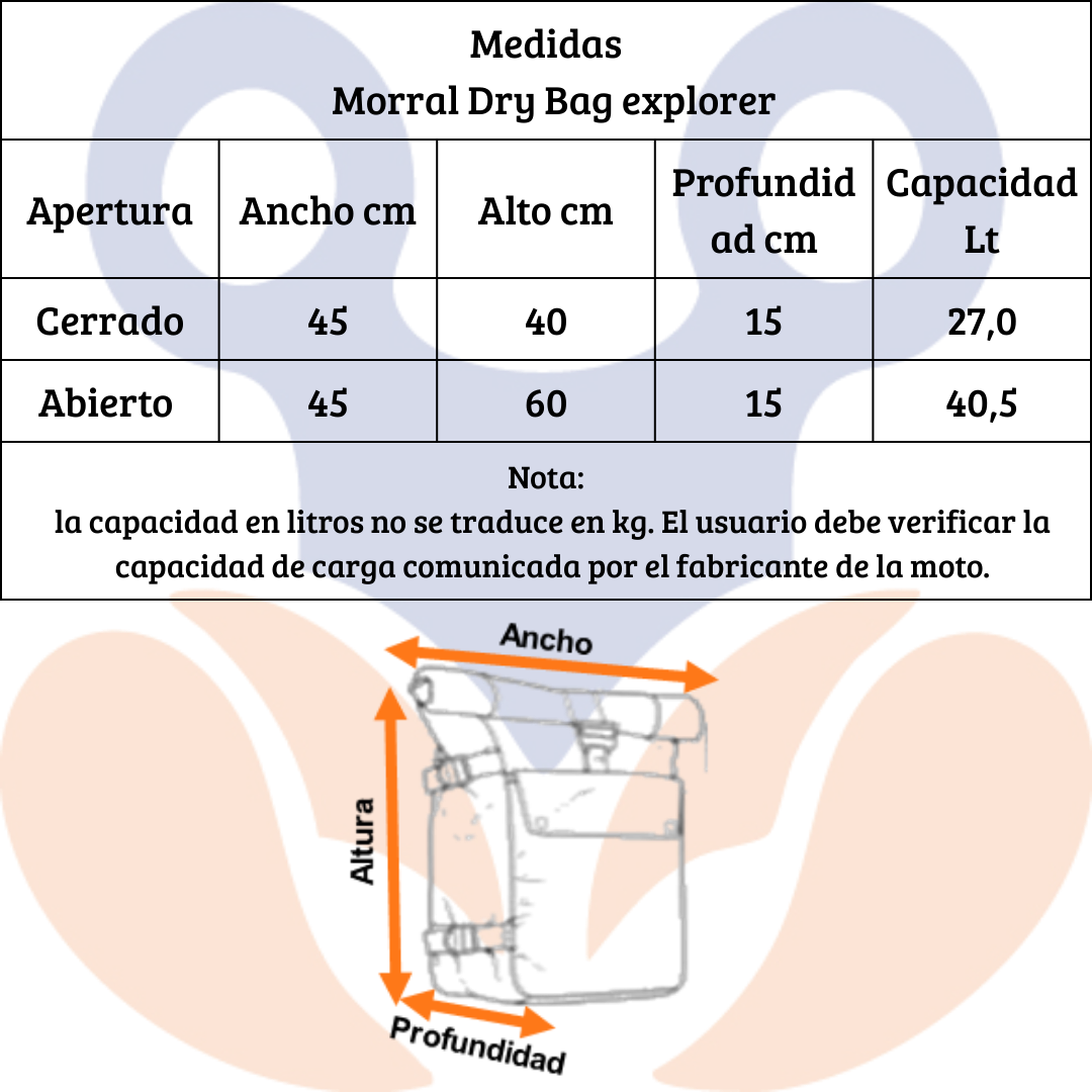 - Para garantizar la impermeabilidad del Morral Dry bag Explorer debes dar 3 vueltas al roll top.